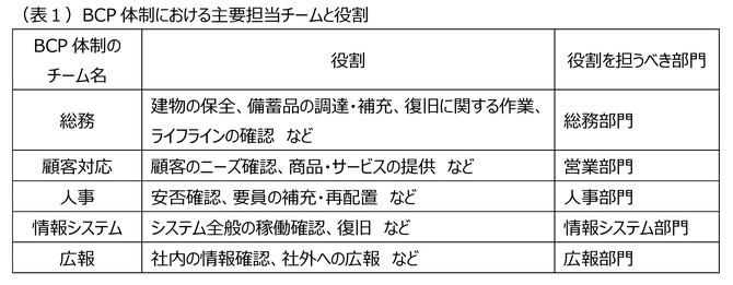 具体的な体制の例は(図2)の通りですが、それぞれのチームを構成するメンバーは、平常時の業務を踏まえて決めることが重要です。例えば、顧客対応チームは営業部門が、また従業員の安否確認は人事部門が担うという形です(表1)。