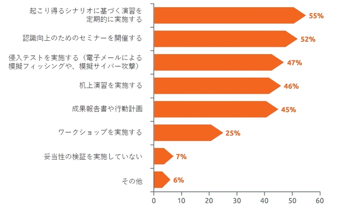また図 2 は、サイバー・セキュリティ事故への対応計画の妥当性をどのように検証しているかを尋ねた結果である(注 4)。前回調査と大きく異なるのは、第 3 位に侵入テスト(penetration tests)が加わっていることである。これも前回調査では選択肢すら無かったものである(注 5)。前回調査と比べると、何らかの演習を実施するというものが全体的に上位に上がってきており、サイバー・セキュリティに関するインシデントの増加に伴い、具体的かつ実践的な対策に取り組む組織が増えていることが伺える。