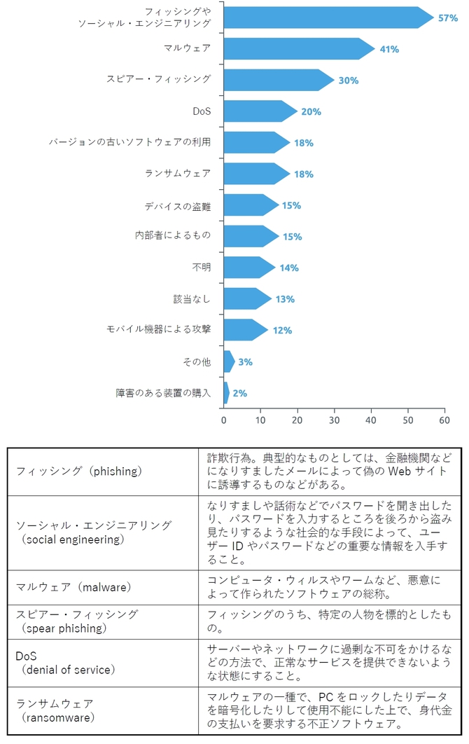 調査結果を見ると、回答者の 64% が過去 12 ヶ月間にサイバー・セキュリティに関する何らかのインシデントを経験しているという。この数字は前回調査とほとんど変わらないが、内訳に若干の変化が見られる。