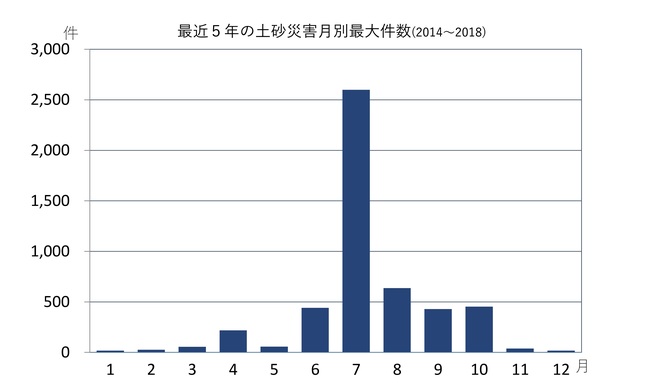 6月は「土砂災害防止月間」に定められている。6月に土砂災害が多いのかというと、必ずしもそうではない。図1を見ると、土砂災害は夏から秋にかけて多いことが分かる。6月は土砂災害シーズンの始まりと言える。