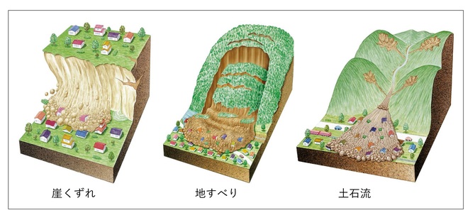 傾斜のある地盤が重力によって下方へ移動することによって起きる災害全般は土砂災害と呼ばれる。その中には、崖くずれなどの斜面崩壊による災害や、斜面全体が移動することによる地すべり災害、水を含んだ土砂が流下する土石流災害などがある(図2)。