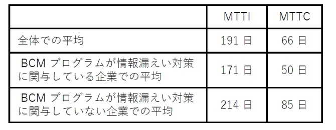 全体の平均は MTTI が 191 日、MTTC は 66 日との事であるが、企業における BCM プログラムが情報漏えい対策に関与している企業と、そうでない企業とに分けて集計すると、表 1 のようになっており、BCM プログラムが関与している企業において、情報漏えい事案に対応する時間が短縮されていることが示されている。