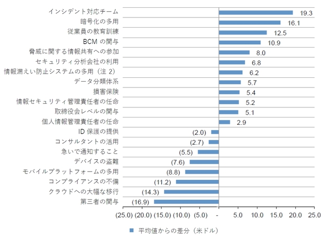 また図 2 は、情報漏えいによって発生したコストに対して、どのような要因が影響を与えたかを調べたものである。グラフの中央が平均値に相当し、グラフが右側に伸びているものほど、データ漏洩 1 件あたりのコストが小さくなっていることを示している。