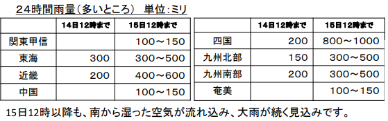 例えば、下の図は令和元年の台風10号の際に発表された気象庁の記者発表資料から抜き出したものです。図の中では地方ごとに24時間雨量の見込みが伝えられています。表のタイトルに「24時間雨量(多いところ)」とあるように、ここで出てくる雨量はそれぞれの地方の「多いところ」で見込まれる雨量です。