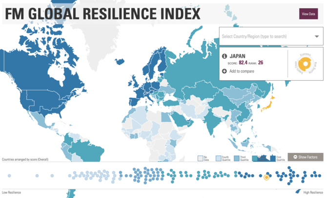 米国の損害保険会社FM Globalは、同社のサイト上で「FM Global Resilience Index」というデータを公開している。これは同社のデータベースを含むさまざまな情報源から得られた情報を基に、約130カ国のビジネス環境に関するリスクを評価した結果をまとめたものである。