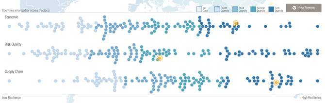 さらに、ここの右側にある「Show Factors」というところをクリックすると、この部分が上に広がり、「経済面」「リスクの質」「サプライチェーン」という3つのカテゴリーごとのスコアにおいて、日本がどの位置にあるかが、図1のように表示される。日本は経済面で12位、リスクの質で51位、サプライチェーンで14位となっている。