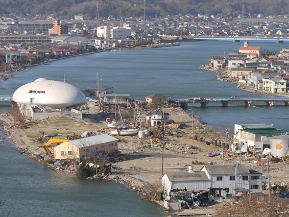 日和山から見下ろした市内の惨憺たるありさまは今も忘れない。足下の市街地は、津波の襲来と旧北上川の氾濫で泥海と化した無残な姿を残していた。地震後の地盤沈下が追い打ちをかけ海水が市街地の奥にまで侵入してきていた。