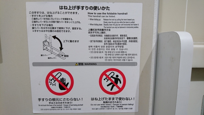 例えば、「はね上げ手すり(可動式手すり)の使いかた」のように各設備には、取扱説明書のようにピクトグラムとイラストを組み合わせて、日本語、英語、韓国語、中国語の多言語表記(複数の言語が並存し表記されていること)で解説をしています。