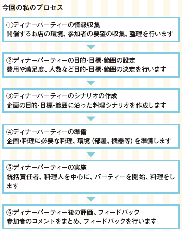 当日は料理シナリオや計画書に基づいて、運営を進めました。綿密に準備していたので無難に実施できると思っていましたが、実際にはハプニングが待っていました。当日の朝8時、下ごしらえをしていた料理の一品を、最終過程の単純なミスで台無しにしてしまいました。一瞬愕然として頭を抱えましたが、すぐに代替手法を検討。残り時間を逆算し、即座に新しい材料調達を友人に依頼し、リカバリーを行いました。