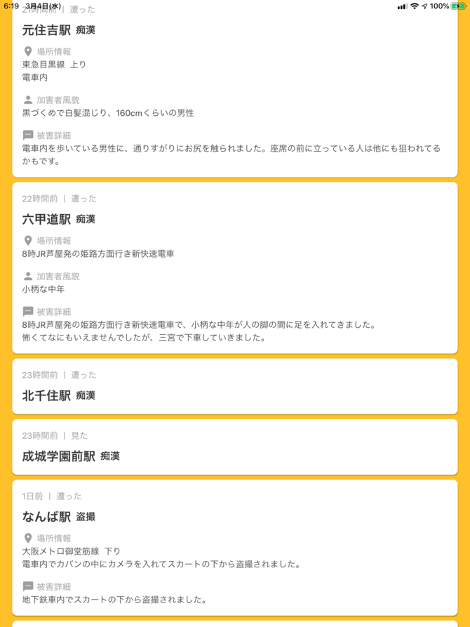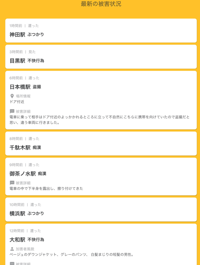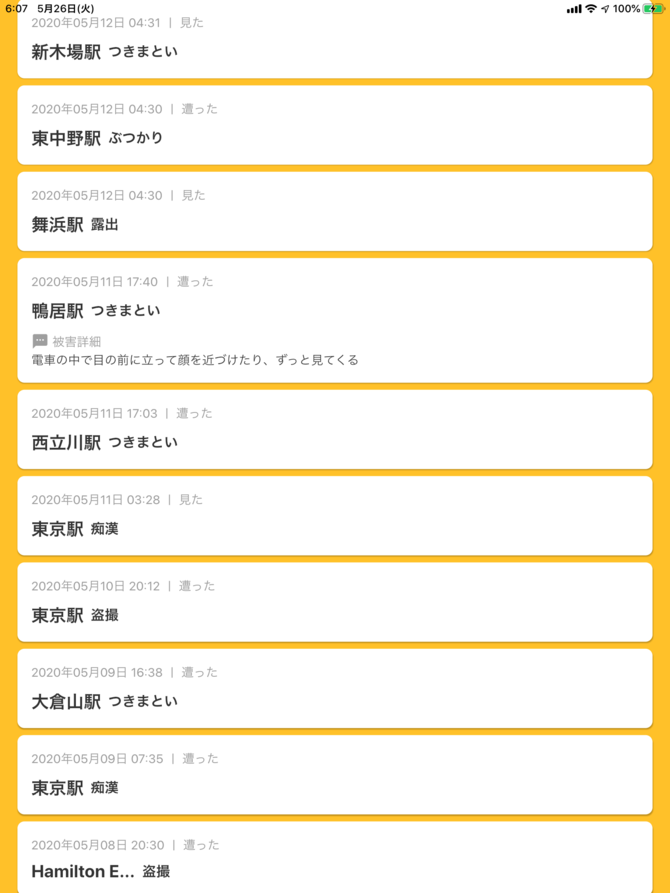 緊急事態宣言中(解除は2020年5月25日)は、5月10日の報告は1件、11日は3件のみと、1月とは報告件数が格段に減っていました。新型コロナウイルス期には、痴漢や迷惑行為の加害者も自分の身を守るために自粛していたということでしょうか? データになっていることで、今後いろいろと解析できる貴重な資料になっています。
