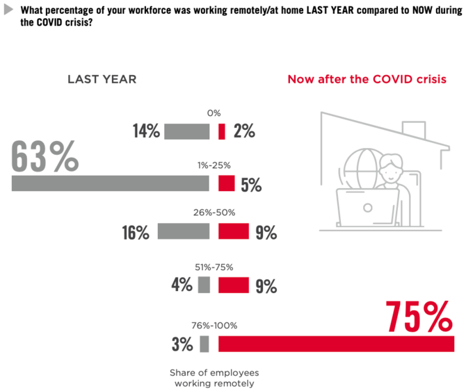 本稿のトップに掲載した図は、従業員の中でリモートワークを実施している人の割合を、昨年(図の左側)と現在(右側)について尋ねた結果である。昨年に関しては1〜25%が63%で最も多いのに対して、現在については76〜100%という回答が75%に達しており、米国においてもリモートワークの導入が急激に進んだ様子がよく分かる。内閣府の調査(注2)によると、日本ではリモートワークの実施率が3割程度とのことであり、これと比べると普及率がかなり高いようである。