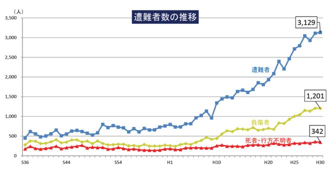 痛ましい山岳遭難は後を絶たない。近年は中高年の登山ブームとかで、登山人口が増える中、遭難件数も増加している。図1は警察庁が公表している過去約60年間の山岳遭難者数の推移のグラフである。これを見ると、山岳遭難者数は平成に入ってから増加し、平成の約30年間で約4倍に増えたことが分かる。