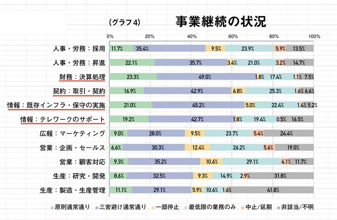 こうした対策が進む一方で、事業継続への取り組みはどのような状況だったのか。人事、財務、契約、情報、広報、営業、生産の各機能について聞いたところ、「原則通常通り」と「三密避け通常通り」を足した回答が50%を上回るものもあり、なかなか業務量を減らせない現場の厳しい実態が浮かび上がった。特に財務(決算処理)、契約(取引・契約)、情報(既存インフラ・保守の実施・テレワークのサポート)については、「三密避け通常通り」が4割を超える。生産については、「非該当」が多く、受注そのものが大きく減って稼働レベルが下がっていることや、休業などが進んでいる状況がうかがえる結果となった(グラフ4)。
