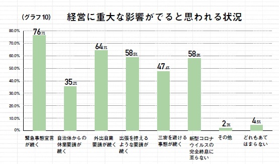 今後、経営に重大な影響が出る事態についても聞いたところ、「緊急事態宣言が続く」が76.1%で最も高かったものの、「三密を避ける事態が続く」(47.6%)、「新型コロナウイルスの完全終息に至らない」(58%)との回答も多く、緊急事態宣言解除後も経営への影響が長期化することを示唆する結果と