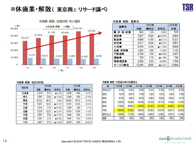 最後に、今後は事業継続を断念する企業が増加するだろう。休廃業・解散会社の件数は倒産件数の実に5倍。今後も減ることなく右肩上がりが続くのではないか。中小企業金融円滑化法の終了時も、出口戦略の一環として国が自主廃業を促したという経緯がある。今回も同じように、新型コロナウイルスの影響によって経営が立ち行かなくなった企業、倒産しないまでも先行きを悲観して廃業を選択する企業が増えてくるのではないかと懸念している。日本の企業においては、リーマン・ショックや東日本大震災等、幾多の苦難を克服してきた経験がある。新型コロナウイルスの影響に対しても、これを糧にして早期に立ち直る企業が多くなることを切に希望する。
