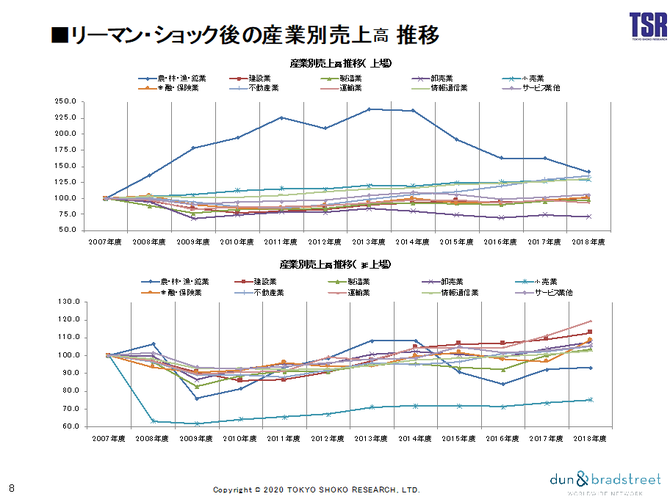 産業別の売上高推移では、今でも卸売業(上場)のようにリーマン・ショック前の水準に戻っていない産業がある。非上場企業では、小売業、運輸業、そして金融業等がリーマン・ショック前の水準まで回復していない。