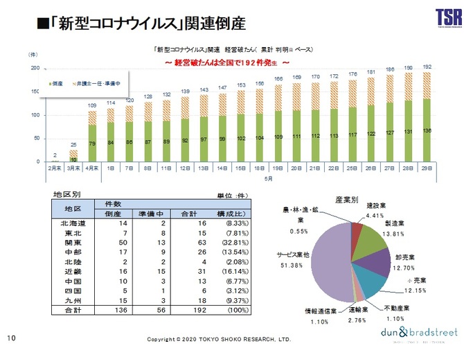現在、新型コロナウイルスの感染拡大が新たな危機となっている。関連倒産は、2月は1件、3月は12件、4月は71件と急増している。要因としては、経営体力が疲弊しているなか、新型コロナウイルスの感染拡大が追い打ちをかけたと言えるのではないか。特に影響を受けている産業は、サービス業、小売業、宿泊業、飲食業、医療・福祉、娯楽等と、消費者に近いところから倒産が増えている。リーマン・ショック時は金融や大企業を中心に徐々に倒産が中小零細企業まで広がったのが特徴。今回の新型コロナウイルスでは、俗にいう川下産業から影響が広がり、裾野が広い。新型コロナウイルスの収束の時期も分からず、悩ましい問題だ。