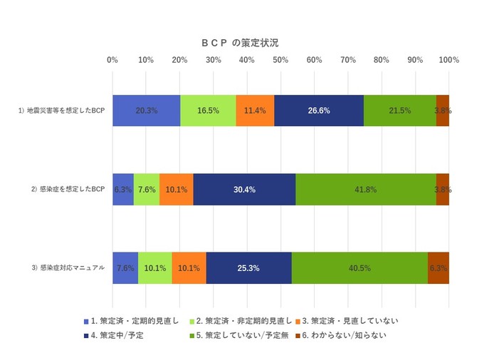 中小企業の危機管理は、感染症対策に限らず総じて大企業に比べ低い。昨年度時点のBCPの策定状況を見ると、感染症以外(自然災害等)については策定している組織が5割弱。主に首都圏を対象にした調査では7割がBCPを策定していたことからその差は歴然としている(グラフ5)。
