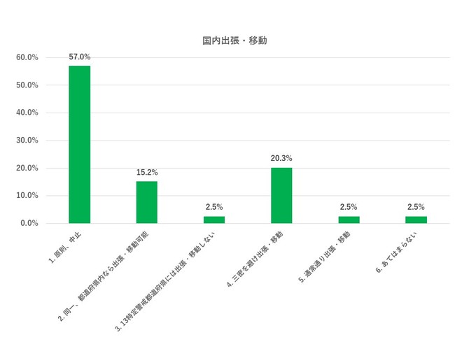国内出張や移動については「原則中止」「同一都道府県内なら可能」「特定警戒都道府県には禁ずる」など、対策のレベルを聞いたが、57%が「原則中止」。首都圏を対象にした調査では76%だったことから、禁止の割合としていた割合は低い。三密を避け、出張・移動を禁止が20.3%、同一県内なら出張・移動可能も15.2%あった(グラフ3)。