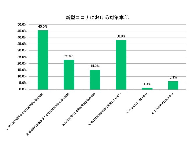 さらに、首都圏企業との差が顕著になったのが対策本部の設置だ。災害時には、事前に計画した体制・対応のもとに、定期的な対策本部会議などによって移りゆく状況を的確に把握し、対応を微修正していくことが求められる。調査では、組織の意思決定機能を支える対策本部会議の開催状況についても聞いたところ、対策本部会議については執行部や役員を含む対策本会議を実施しているとの回答が45.6%(首都圏企業を対象にした調査では63.9%)と突出して高くなったが、特に対策本部会議は実施していないが38%もあった(同18.1%)(グラフ4)。