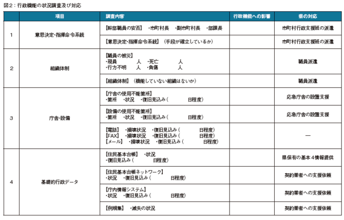 被災状況調査に用いる調査票は、意思決定・指揮命令系統、組織体制、庁舎・設備、基礎的行政データなどの項目に基づき、調査内容や行政機能への影響、県の対応が記入できるテンプレートを用意した(図2)。住民票および戸籍の交付、出生届死亡届の受理、罹災証明書の発行など応急的行政サービスの提供状況、情報システムの運用状況などが書き込めるテンプレートもある。