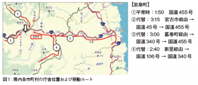 調査班は、被災市町村の数や状況に応じて、最大5班が概ね48時間以内に災害対策本部支援室と連携の上、現地に派遣されることになっている。各市町村へのルートは、平時と複数の代替ルートを図面で示した(図1)。