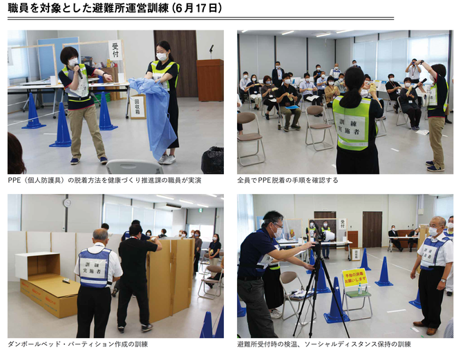 6月17日と19日には、検証結果をふまえて職員のみの訓練も実施。特に個人防護具(マスク、ガウン、手袋、フェイスシールドなど)の着脱とダンボールベッド、ダンボールパーティションの作成は手順と方法を入念に確認、避難者の受付、物資支給時の動線も確かめた。