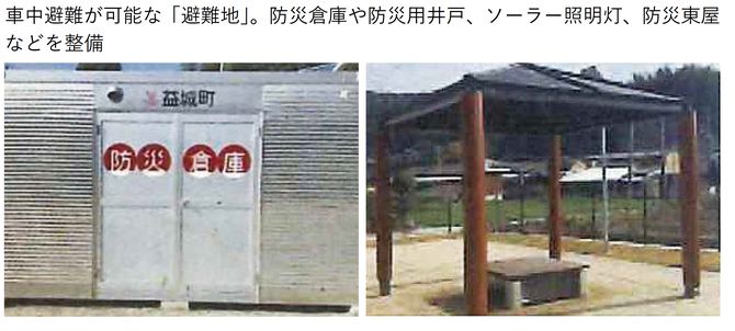 町の洪水ハザードマップでは、中央部を横切る木山川、秋津川が氾濫した場合、最大で町域の数分の1が浸水エリアになる。住民の迅速な避難とともに、車の安全な退避が必須。そのため町では、安心して車中避難ができる場所を急ピッチで確保している。