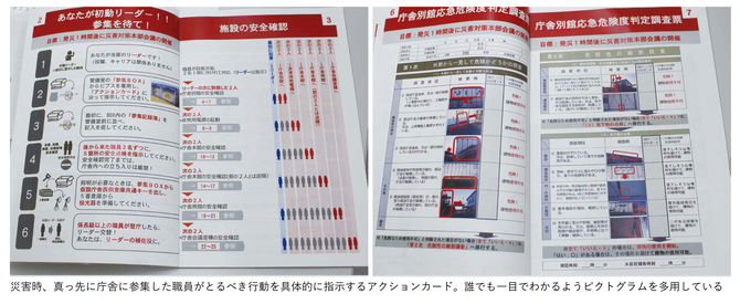 最初に庁舎にやって来る職員がベテランとは限らない。しかし、誰であってもまずすべきことは安全確認。建物のどこをどのように点検すればいいのか、手順とチェックポイントが写真付きでまとまっていれば、1年目の職員でも対応できる。