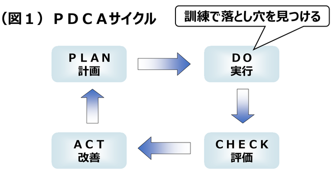 訓練は、この「PDCAサイクル」の「実行(DO)」に該当します。実際に訓練を実施すると、手順通りに進まないことや足りない資器材が出てくるなど、BCPの不備や欠けている点、つまり落とし穴が明らかになります。そこで、実施した訓練の結果を踏まえて計画を見直し、それに基づいて修正することが重要です。