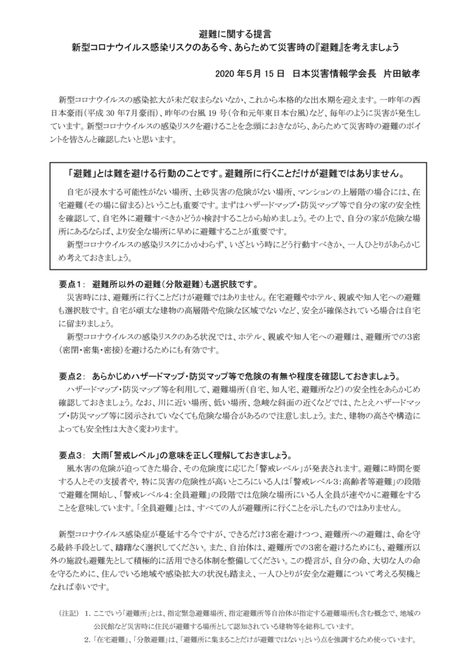 今年の5月に、日本災害情報学会が「避難に関する提言:新型コロナウイルス感染リスクのある今、あらためて災害時の『避難』を考えましょう」を発表しました。