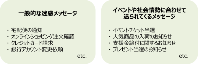 このような怪しいメッセージは、普段から、宅配便の通知、オンラインショッピングのアカウント確認、銀行・クレジットカードのアカウント確認を装った文面で送られてくることもあるが、イベントや社会情勢に合わせた内容で送られることもある。ここで、メッセージと表現しているのは、メール、SMS(Short Message Service)、SNS(Social Networking Service)など、さまざまな手段を含んでいるためである。