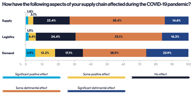 図1は新型コロナウイルスのパンデミックによる影響の度合いを、調達(supply)、物流(logistics)、需要(demand)の観点から尋ねた結果である。有害な影響(detrimental effect)は総体としては需要側よりも調達側の方でより大きくなっているが、非常に有害な影響(significant detrimental effect)はむしろ需要側の方が大きくなっているのが興味深い。