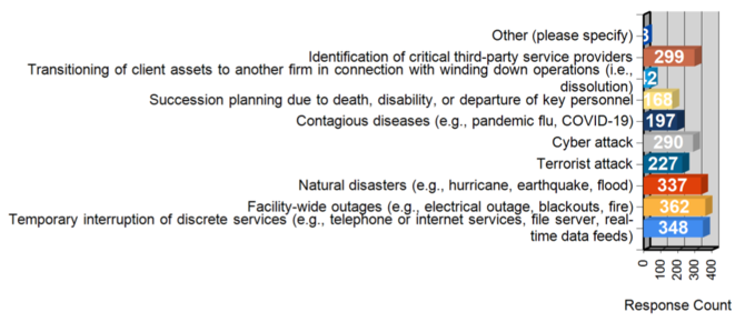また、「後継者問題」(Succession planning)という回答が168件(約46%)、また少ないながら「解散などで事業を縮小する際に顧客の資産を別の機関に移す」(注3)という回答があることも注目に値する。いずれもコンプライアンスという観点ならではの設問と言えよう。特に後者については、事業を継続させるというよりも、継続できないときでもいかに顧客の資産を守るかという、投資顧問業としての責任を果たすための計画ということであろう。