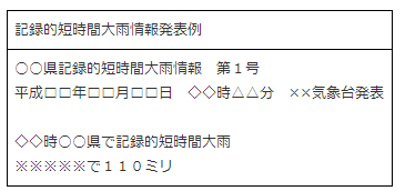 「◇◇時○○県で記録的短時間大雨」の「◇◇時」とは、「◇◇時までの1時間に」という意味です。「※※※※※」には、記録的な短時間の大雨を観測した観測点名、その後に雨量が記述されます。