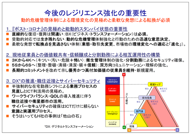 今後のレジリエンス強化に向けて、ポストコロナの見極めという意味では動的なスタンバイ状態をとることが必要。今の危機状態がどのレベルなのか、政府が緊急事態宣言を出したからではなく、わが社にとって、顧客にとってどういう状態なのかを見ながら、危機対応レベルを変化(へんげ)していく。危機対応の転換点を見逃さないこと。エクスポージャー管理を含め、市場の環境変化に適応し、進化していくことを危機管理体制の中でやらなければいけない。