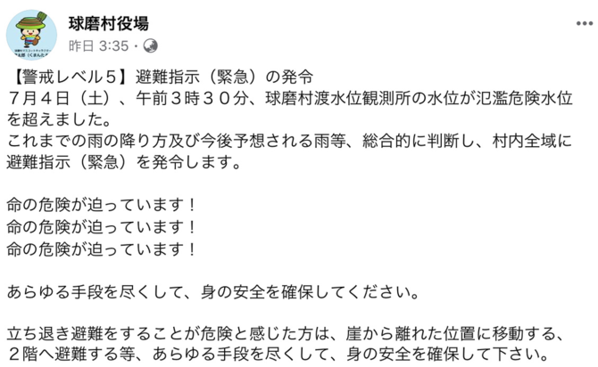 3時30分になると、球磨村役場がすでに災害が発生しているレベルでもある警戒レベル5(避難指示、緊急)情報を発令します。ここでは、氾濫危険水位を超えていることが記載されていて洪水が意識できる情報になっています。