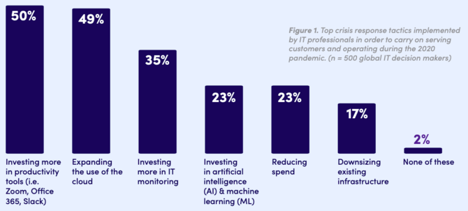 また「ITのモニタリングへの投資を増やす」という回答が35%ある(注3)。その理由や背景についての考察は特に記述されていないが、リモートワークの増加に伴ってセキュリティー上の懸念(例えば不正侵入など)が増加することや、IT部門のスタッフがリモートワークとなることでシステムの稼働状況が把握しにくくなることが、追加投資の理由なのではないだろうか(筆者の推測である)。