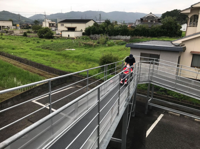 写真の住宅は、元は、被災した賃貸住宅です。被災後、利用されないままになっていたので再利用できないものかと大家さんからお声がけがあったそうです。ただ通常の賃貸住宅仕様ですから、お年寄りに優しい施設ではありません。水害時の避難も心配です。そこで、車椅子でも利用できるようにスロープを後づけで設置しました。この角度は「10分の1勾配」と呼ばれるもので、10メートル進むごとに1メートル高さが上がる仕様です。