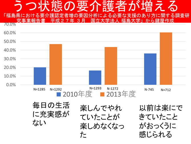 そして、心の健康では、東日本大震災後、次のようにうつ症状を持つ人が顕著に増えています。