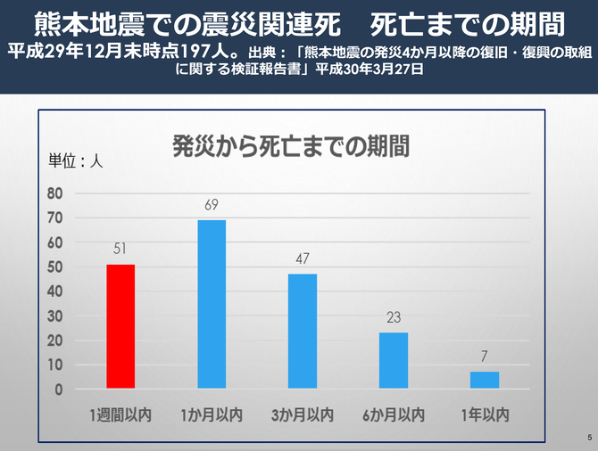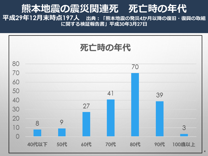 これを見ると、死亡時の年代は、高齢になるほど増えていきます。90代になると下がりますが、元々の人口が少ないためです。また、発災後1週間、1カ月以内という早い時期に亡くなる方が多い。発災当初の避難生活が高齢者にいかに過酷なことか、考えさせられます。