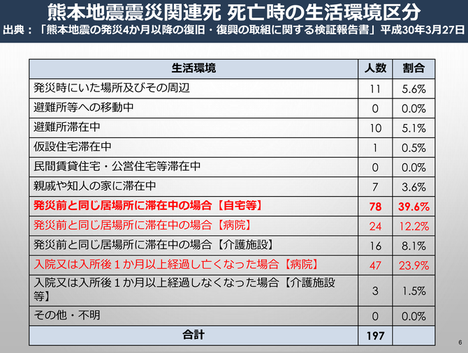 「自宅にいるから安心」ではなく「自宅だから危険」と考えを改めなくてはなりません。このデータを見て以来、私たちボランティアも、早く在宅の被災者を訪問して支援をするとともに、具合の悪い方を発見することが大事というのが常識となっています。