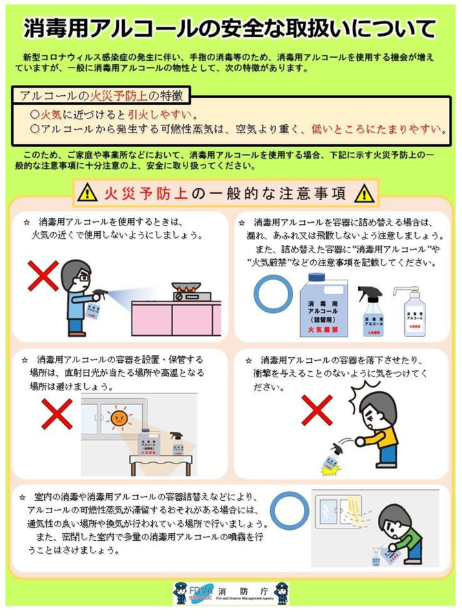 今般の新型コロナウイルス感染症の予防対策で、消毒用アルコールを使用する機会が増えています。消毒用アルコールは火気により引火しやすく、また、発生する蒸気は可燃性で空気より重く低所に滞留しやすいため、取り扱う場合には次の項目に注意してください。