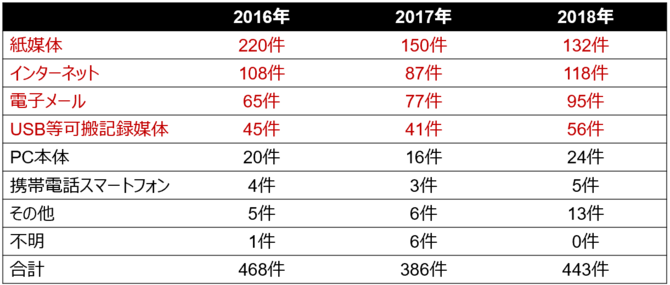 内部不正にはどのような媒体が利用されているのだろうか? 特定非営利活動法人 日本ネットワークセキュリティ協会(以下、JNSA)が発行している「情報セキュリティインシデントに関する調査報告書」(2018年版)から、過去3年間で発生した個人情報漏えいインシデント件数を媒体・経路別に確認できる(表1)。内部不正で利用される媒体・経路も、おおよそこの通りとなる。