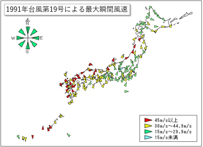 図1に、台風第9119号によって観測された各地の最大瞬間風速とその風向きを示す。台風の通過した沖縄県、九州北西部と山口県のほか、本州の日本海側で毎秒45メートル以上の最大瞬間風速が観測されている。本州の日本海側で観測されたものは、南西(南~西)から吹きつける暴風である。この暴風が大きな果樹被害をもたらした。
