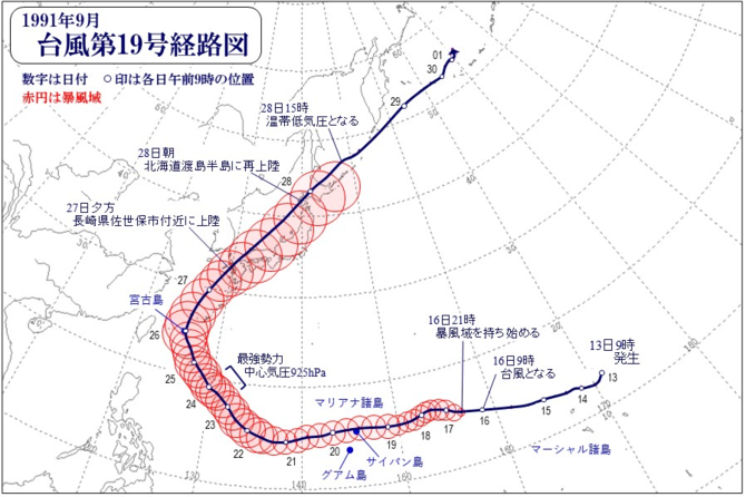 図2に、台風第9119号(リンゴ台風)の経路図を示す。きれいな放物線を描いており、典型的な秋台風である。この経路図を見るだけで、当時の気圧配置の構図が分かる。放物線の形は太平洋高気圧の勢力範囲を示す。台風中心が最も西に位置したところを転向点(てんこうてん)といい、図2では南西諸島の宮古島付近(北緯25度)がその位置である。そこでは、台風の西向きの移動成分がなくなり、東向きの移動成分が現れ始める。転向点は太平洋高気圧の尾根(東西に延びる勢力軸)の位置をも示す。このときは、それが北緯25度付近にあったことが分かる。これは、この時期としては標準的な位置である。
