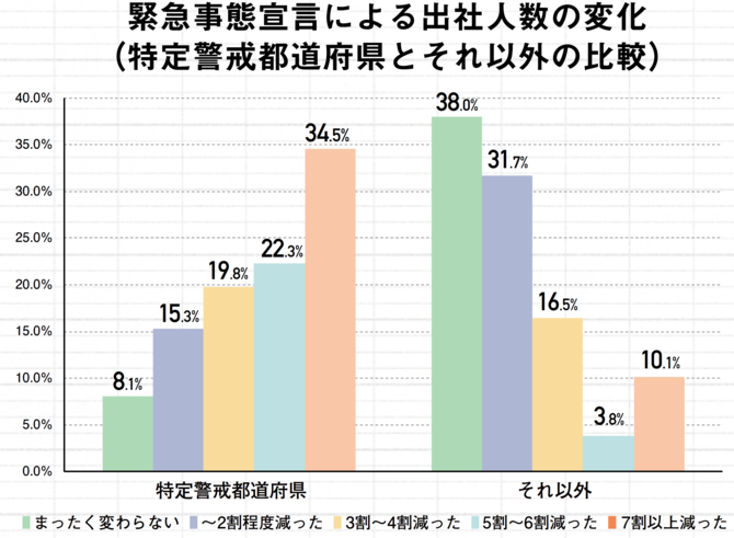 アンケートではまず、特定警戒都道府県内に本社がある組織と、それ以外の組織について、それぞれ4月7日の緊急事態宣言後に本社の出社割合が何割程度減ったかを聞いた。