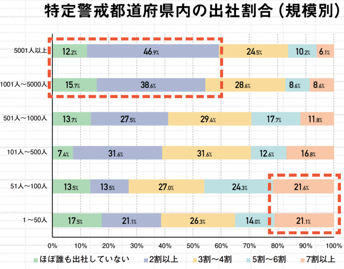また、特定警戒都道府県内に本社がある組織を規模別にみると、100人以下の組織では、7割以上出社している割合が20%を超えた一方で、1000人以上の大組織では2割以下の出社が半数を超えており、組織規模によって在宅勤務の環境整備に差があることをうかがわせる結果となった。