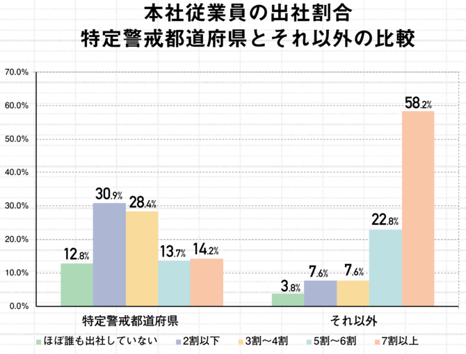 急事態宣言後の出社人数については、特定警戒都道府県内では「2割以下」「3割〜4割」との回答が多かったものの、政府が目指す「出勤者最低7割減」には届いていない。特定警戒都道府県以外については「7割以上が出勤している」との回答が突出して高く、在宅勤務がほとんど進んでいない現状を浮き彫りにした。