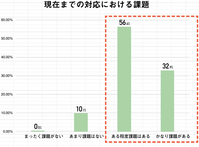 その結果、9割近い組織がこれまでの対応について何らかの課題を感じており、そのうち3割を超える組織がかなり強く課題を感じていることが明らかになった。